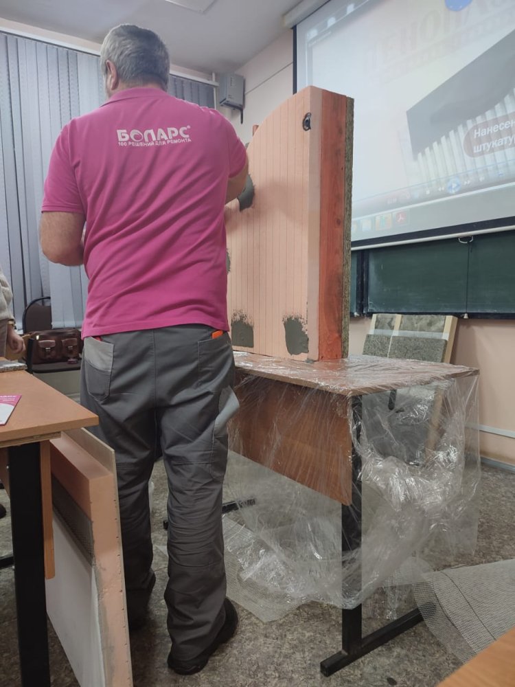 Технические специалисты компании "БОЛАРС" провели профессиональный мастер класс по созданию штукатурного фасада каркасного дома с помощью нанесения сырых смесей.